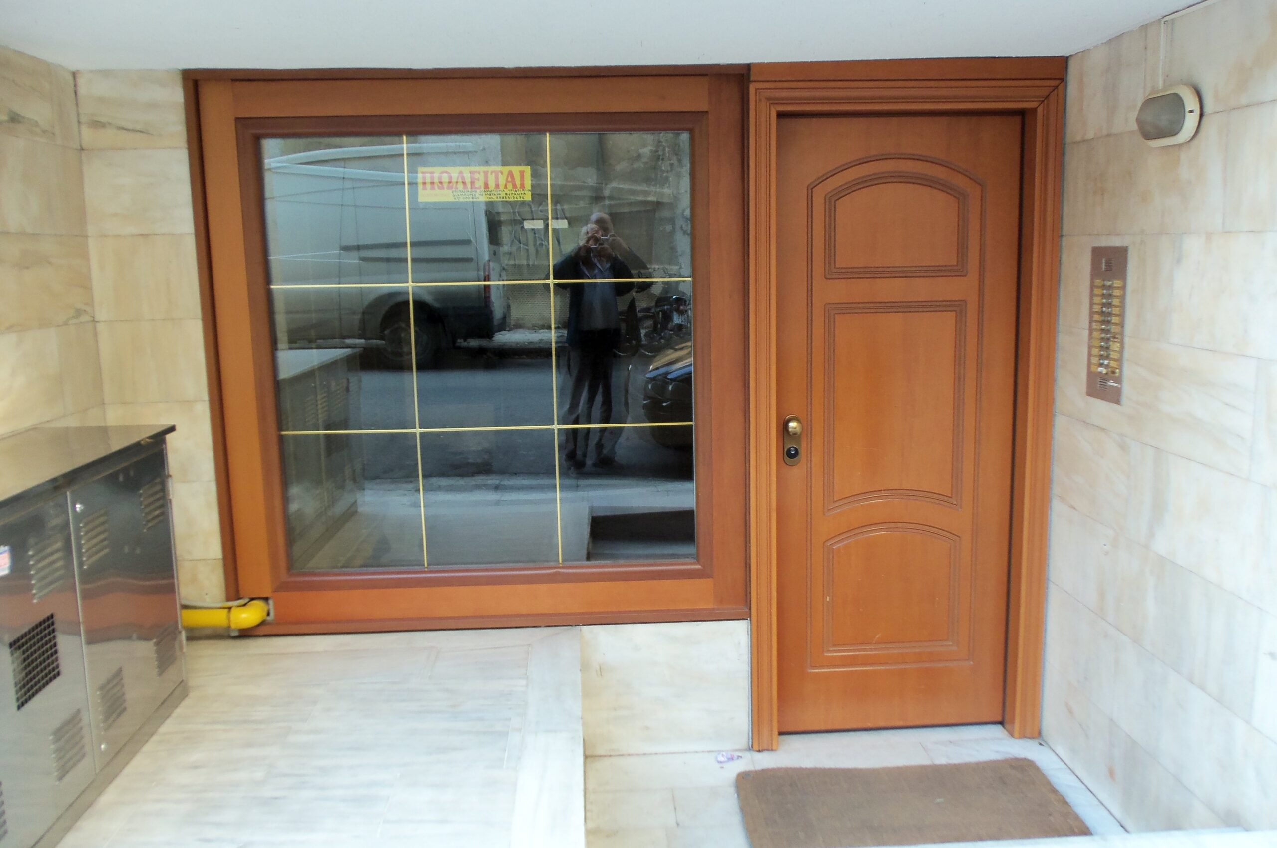 Κεντρική είσοδος ασφαλείας με ένα πλευρικό σταθερό. Καϊτια χρυσά και άνοιγμα για διέλευση σωλήνα φυσικού αερίου. Εξωτερικά περβάζια antony.
